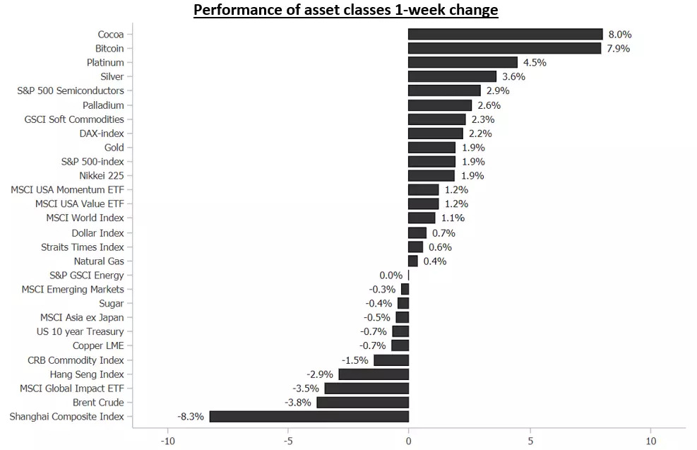 Gains were registered in precious metals too, with gold and silver prices edging up 1.9% and 2.9% respectively for the week. The highlight may revolve around oil prices, which are down 3.8% over the past week. Market participants have been fading geopolitical risks on the rising prospects that Iran’s energy infrastructure will not be in Israel’s crosshair, triggering a wave of profit-taking in crude oil prices.
